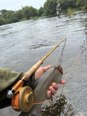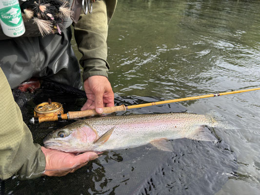 8月は、とても良かったです。いつもは虫の少なさにライズが少なく苦戦するのが8月ですが、今年は羽アリが多く、蝶々、蛾、バッタが多く、魚の意識は水面で、大きなフライでも反応が良かったです。夏でも水温が低く、虫が多いという条件がキーポイントだった感じです。お客さんが私の釣りを見たいと言ってくれたので、私も1匹釣らせてもらいました。何度かライズをしてたブラウントラウトでした。